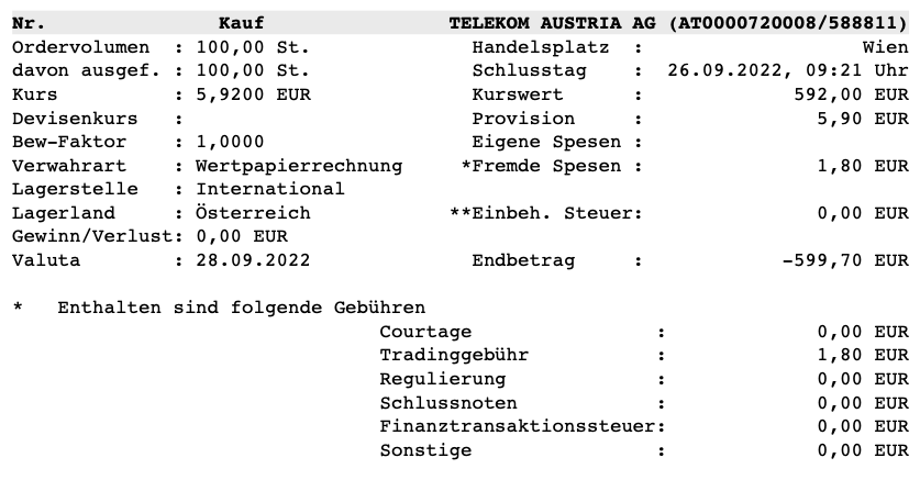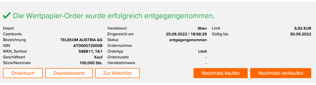Neben dem Kursrutsch der österreichischen Werte aufgrund der Situation in der Ukraine kam mir auch das Helikoptergeld der Bundesregierung (Klimabonus und Anti-Teuerungsbonus) gelegen und ich entschied, dieses in meinen ersten Einzeltitel zu investieren. Als Handelsort wählte ich die Wiener Börse und setzte ein Limit für 100 Stk., bei dem ich inkl. Ordergebühren unter 600€ rauskomme.