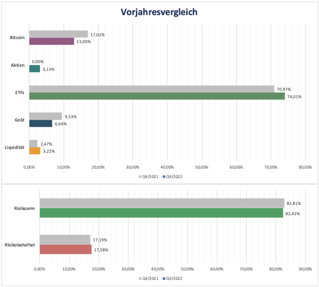 Noch deutlicher erkennt man den Kursrutsch von Bitcoin im Vergleich mit dem Vorjahr, wo bei deutlich geringerer Investition die Allokation noch deutlich höher war. 😅