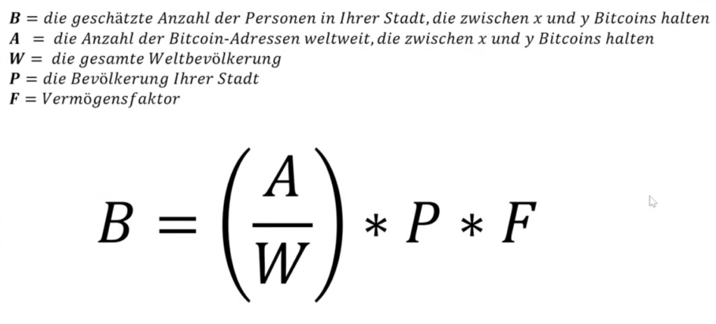 Bei dieser Formel wird die aktuelle Anzahl an Adressen (Nutzer) berücksichtigt, welche einen gewünschten Stack bereits (mindestens) halten. Zudem wird ein Vermögensfaktor eingeführt, welcher von Land zu Land unterschiedlich ist und das aktuelle Vermögen pro Kopf berücksichtigt.