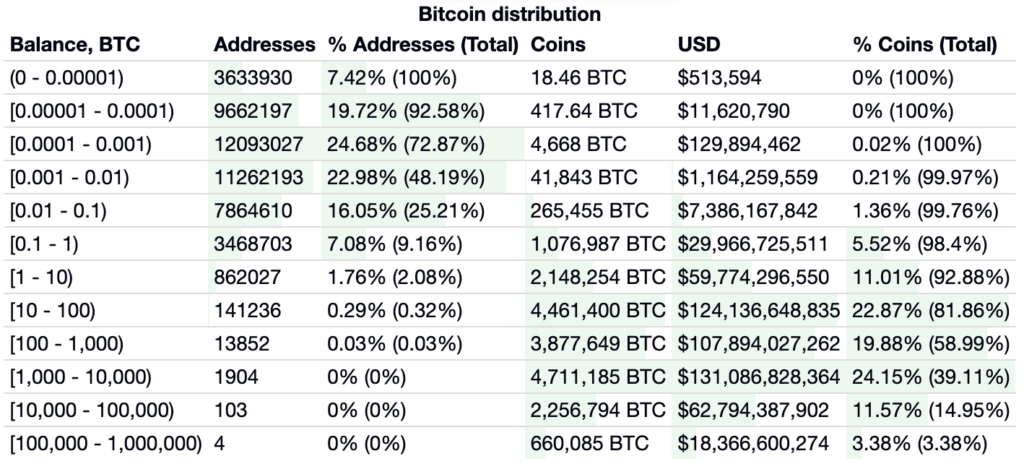Oftmals hört man ja, dass die Verteilung von Bitcoin gleich ungerecht sei wie das aktuelle FIAT-System, sprich der Großteil des Vermögens würde bei einigen wenigen liegen. Die Bitcoin-Timechain (besser bekannt als Blockchain 😉) ist in dieser Hinsicht ja erbarmungslos ehrlich, nachdem alle Balances öffentlich dokumentiert und nachvollziehbar sind. Eine dieser Grafiken ist die „Bitcoin Rich List“, welche mit heutigem Stand unten ersichtlich ist: