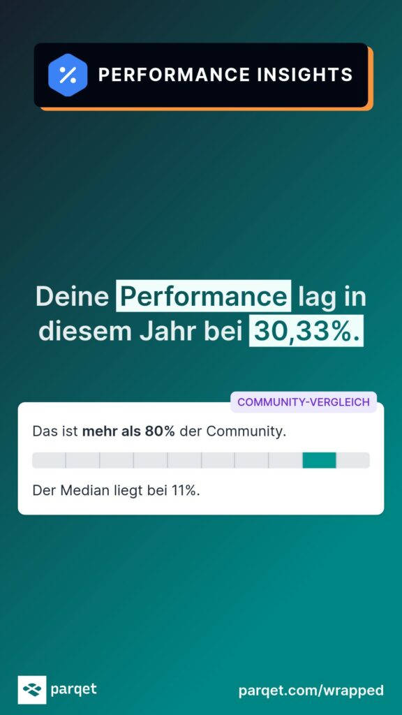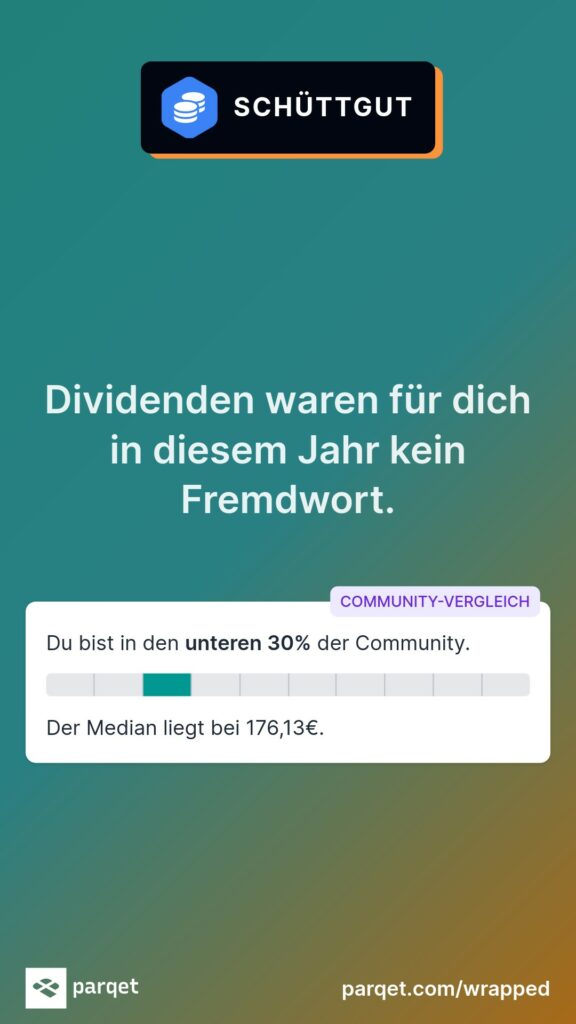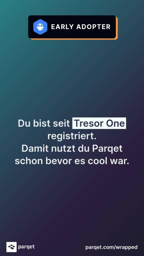 Etwas verwundert war ich über die Kaufstatistik dann doch, da nur 89% meiner Aktivitäten Käufe waren. Grund dafür: Die Ausbuchungen für den Wallet-Transfer bei 21bitcoin sowie die Aus- und Einbuchung nach dem Spin-Off der TA. Bei den Dividenden liege ich im Vergleich zur Parqet-Community hingegen im letzten Drittel, kein Wunder, denn ich bin ja kein Dividenden-Investor. 😜 Nett ist dagegen doch die Anmerkung von Parqet, dass ich bei der Nutzung des Tools zu den Early-Adoptern gehört habe, denn als ich startete, war das Tool noch als „Tresor One“ bekannt. 😉