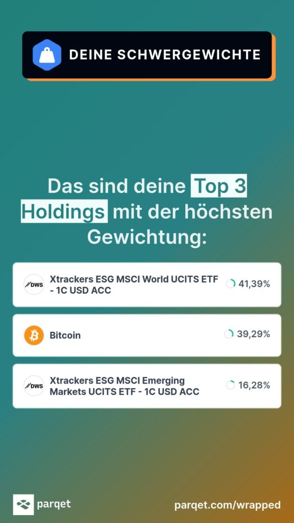 Ein bisschen Wehmut schwingt hingegen noch mit, dass Parqet nach wie vor kein Gold tracken kann, womit mein Portfolio dort leider nicht vollständig angezeigt und getrackt werden kann. Hoffe, dass in 2024 dieses Feature endlich implementiert wird, ebenso der volle Breakdown der ETF-Holdings. Das muss ich jedes Quartal noch per Excel und Morningstar-Daten durchführen. 😬