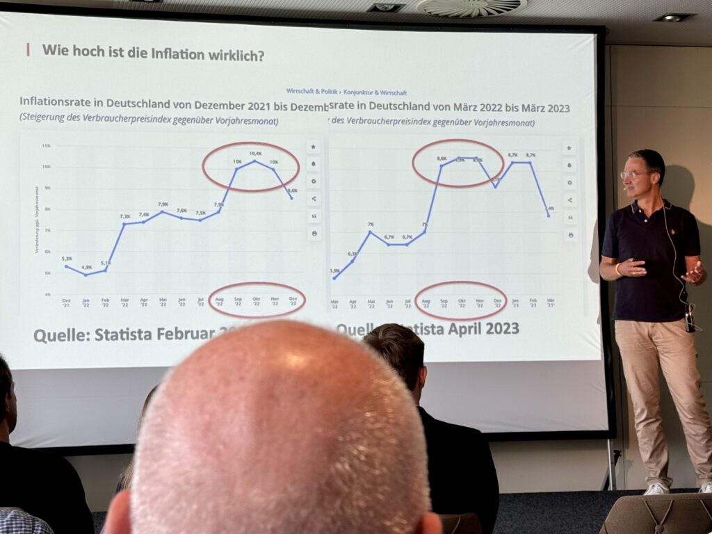 Begonnen hat Alex von Frankenberg mit einem Vortrag über den Netzwerkeffekt von Bitcoin. Spannender Take für mich: Er zeigte zwei Charts, wo bei Statista innerhalb von 2 Monaten plötzlich die offiziell gemeldete Inflation um 2% gesenkt wurde. Grund: Eine außerordentliche Anpassung des Warenkorbes, welches Rückwirkend eine Änderung bewirkte. 🥸