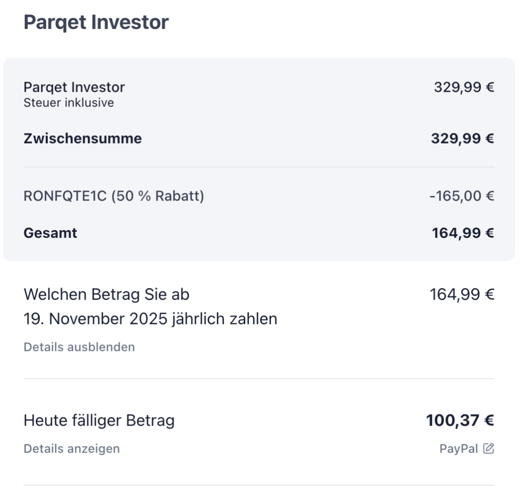 Letztlich habe ich nach dem FF-Stream von Sumit dann beschlossen den Deal aus zwei Gründen anzunehmen: Erstens, das mehr an verfügbaren Portfolios kann mal angenehm sein wenn ich Dinge teste bzw. auch für die Familienmitglieder Tracking durchführen würde/werde (dafür sollen auch weitere Features kommen) und zweitens gehört Parqet zu einer der wenigen SaaS-Produkte, die meiner Meinung nach wirklich super Arbeit leisten und ich gerne auch finanziell unterstütze. Somit sind die ca. 8,5€ p.M. auch mental sinnvoll investiert und fördern die Weiterentwicklung eines tollen Produktes. 🥳
