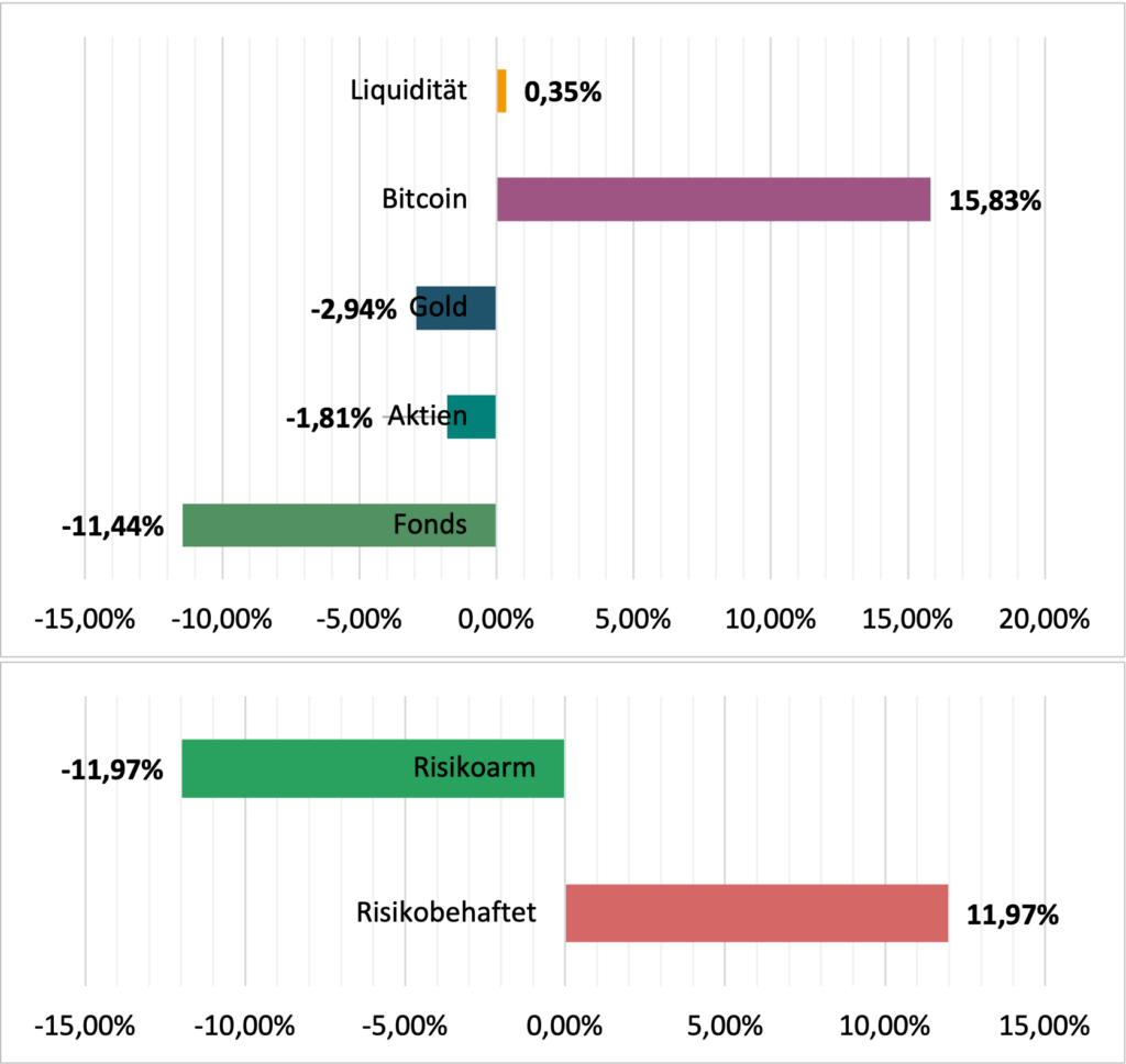 Hinsichtlich der aktuellen taktischen Abweichung macht sich natürlich die Übergewichtung von Bitcoin sehr klar bemerkbar, generell führt die starke Performance zu einer zunehmenden Ungleichheit zwischen dem risikoarmen Teil und dem risikobehafteten. Auch hier wird 2025 eine Anpassung der Allocation notwendig sein.