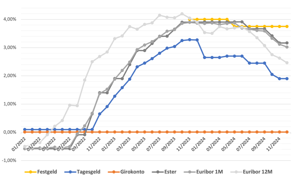 Im Zinsbereich sehen wir weiterhin starke Reduktionen nach unten. Neben dem Euribor sinken vor allem die Sparzinsen bei allen Banken. Für mich persönlich ist der Großteil aktuell jedoch noch zu ganz guten Zinsen gebunden und ich muss mir das ganze dann im Frühjahr 2025 wieder genauer ansehen, insbesondere auch hinsichtlich der Immobilie.