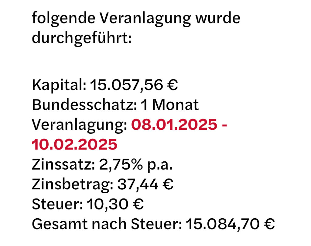 In erwarteter Voraussicht habe ich jedenfalls nochmals einen Betrag vom Tagesgeld nach Bundesschatz umgeschichtet um mir noch für ein Monat die höheren Zinsen zu sichern. Damit liegt nun der Großteil des nicht am Festgeld gebundenen Kapitals auf 1M Bundesschatz, voraussichtlich auch die nächsten Monate noch. 😉