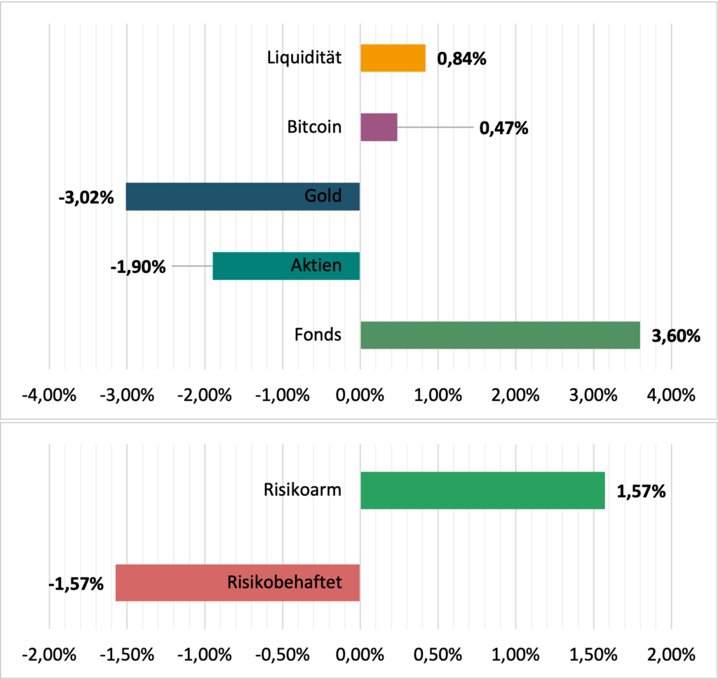 Daher gab es keine wirklichen Verschiebungen in der taktischen Allokation. Die Liquidität ist etwas erhöht, da ich ja zu Jahresende etwas Geld für Nachkäufe bei Flatex geparkt habe. Der Fondsanteil stellt aufgrund der guten Kursentwicklung die größte Abweichung dar. In der Risk-Allocation sind wir auch sehr ähnlich, aber hier wird es in den nächsten Monaten wohl zu einer Verschiebung Richtung „Risikoarm“ kommen, was immer noch am EK für das Projekt „Bau“ liegt.