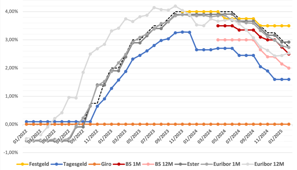 Ende Jänner hat die EZB wie erwartet die Zinsen um 25 Basispunkte gesenkt wodurch nun der Einlagezins auf 2,75% gefallen ist. Weiterhin fallen also die Sparzinsen bei praktisch allen Banken und ich vermute, dass im Februar wohl auch meine Hausbank auf unter 1,5% fallen wird.