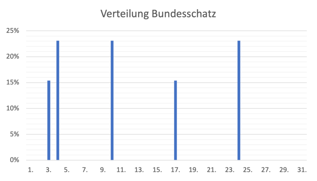 Um hier dennoch den Charakter von Tagesgeld zumindest Näherungsweise zu behalten, wurden die Beträge nun so verteilt, dass nur wenige Tage zwischen potenziellen Auszahlungen überbrückt werden müssen und somit nur ein minimaler Betrag am Tagesgeld bei der Hypo Tirol verblieben ist. Das wirkt sich wie oben bereits ersichtlich wurde natürlich massiv auf den Anteil an Staatsanleihen im „risikofreien“ Anteil des Portfolios aus.