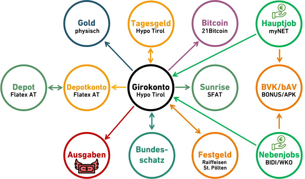 Dreh und Angelpunkt ist natürlich mein Girokonto, in welches sowohl Einnahmen, als auch Ausgaben fließen. Von den Einkommen fließt ebenso noch ein Teil in die betriebliche Vorsorgekasse (BVK). Der Bundesschatz und das Raika Festgeld ist so aufgestellt, dass dort auch wieder Geld zurückfließen wird, wohingegen bei sowohl Gold und Bitcoin, als auch den Wertpapierdepots keine Rückflüsse bis zur Pension geplant sind. Alles in allem finde ich die Darstellung noch recht übersichtlich, auch dem geschuldet, dass ich versuche möglichst wenige Konten bzw. Töpfe zu betreiben – schließlich bin ich ja kein Broker-Tester. 😅