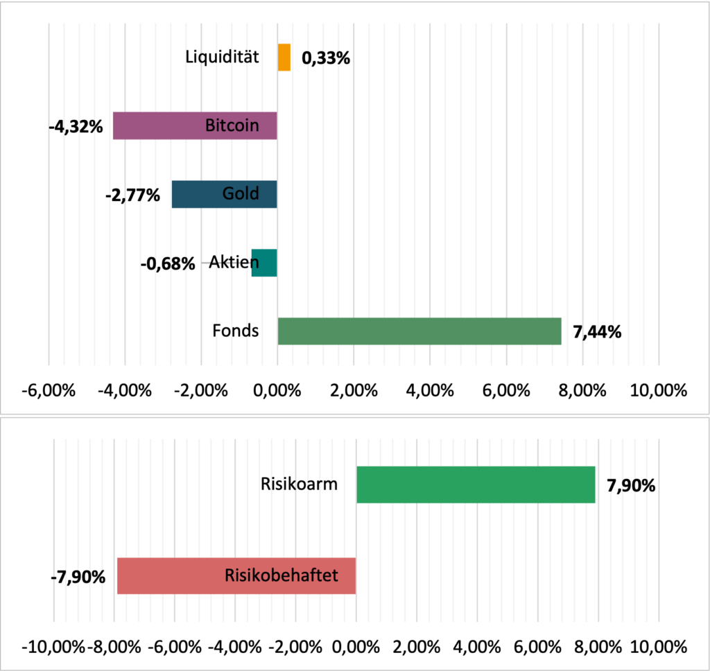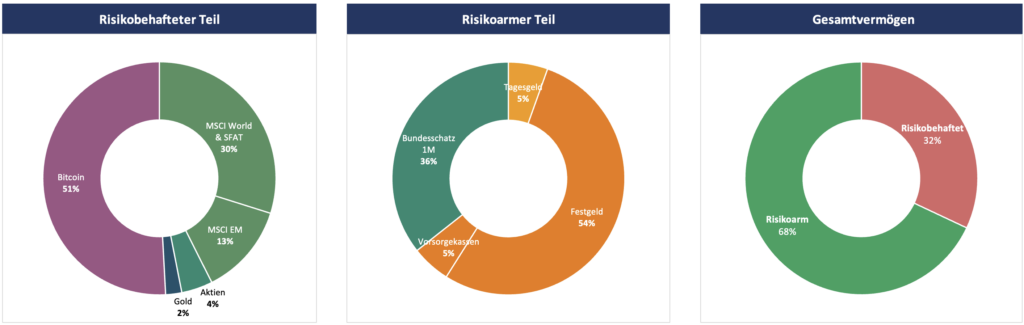 War er im Dezember 2024 noch bei 10% und nur 7% davon im 1M Bundesschatz sind es nun 36%. Auch in der taktischen Abweichung sieht man, dass die Liquidität nach dem Kauf von Strategy praktisch bei 0% liegt und ich somit voll investiert bin. Bitcoin liegt unter seiner Zielgewichtung, ebenso Aktien aber beides dem Crash geschuldet. Gold steht unverändert recht hoch und ist deshalb auch untergewichtet. Der Überhang des risikoarmen Anteils hat sich ebenfalls vergrößert.