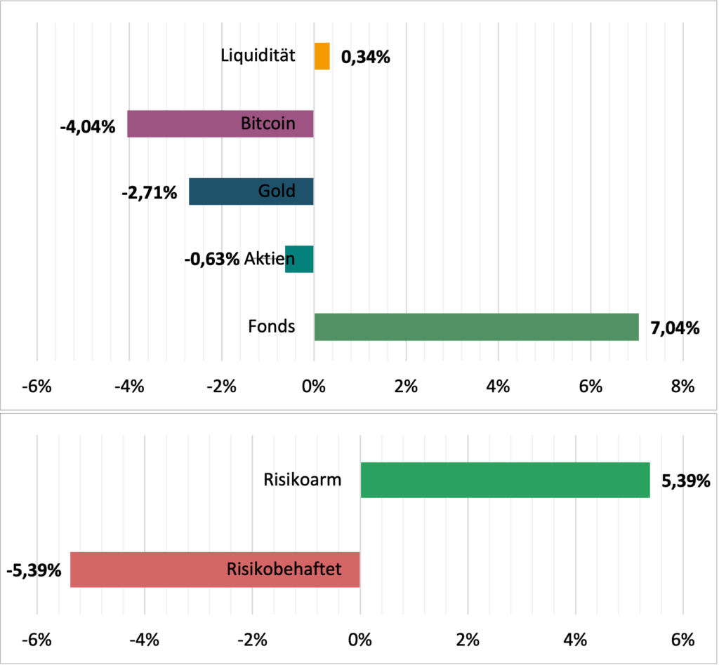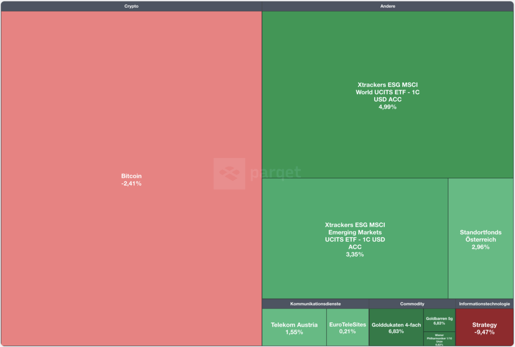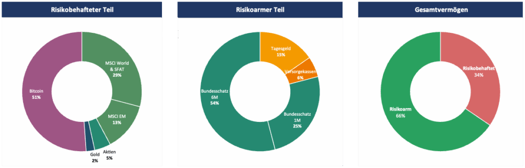Bei der taktischen Gewichtung zeigt sich der negative Bitcoin-Kurs und damit ein Untergewicht, welches sich aber bei einer Erholung bzw. einem Ausbruch nach oben recht schnell verschieben wird. Dennoch konnte ich nicht ganz widerstehen und habe beim Dip zur Mitte des Monats nachgekauft. Sowohl bei Flatex, als auch für die Eigenverwahrung. 😜