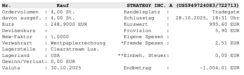 Bereits seit dem Sommer hatte ich immer wieder überlegt, was ich mit meiner Strategy Position anstellen soll. Verkaufen, oder doch aufstocken? 🙈 Die Beobachtung der letzten Monate und auch der Besuch auf der BTC Prag hat mir gezeigt, dass wohl die Bitcoin-Treasuries die NFT-Bubble dieses Zyklus sein werden. Tausende Unternehmen, welche eigentlich ein kaputtes Geschäftsmodell haben glauben, mit BTC wieder zu drehen und für Anleger attraktiv zu sein. Hier muss irgendwann Blut fließen und obwohl ich die ganzen Produkte von Saylor, die Yield-on-Bitcoin versprechen skeptisch sehe glaube ich, dass Strategy immer noch sehr solide aufgestellt ist.