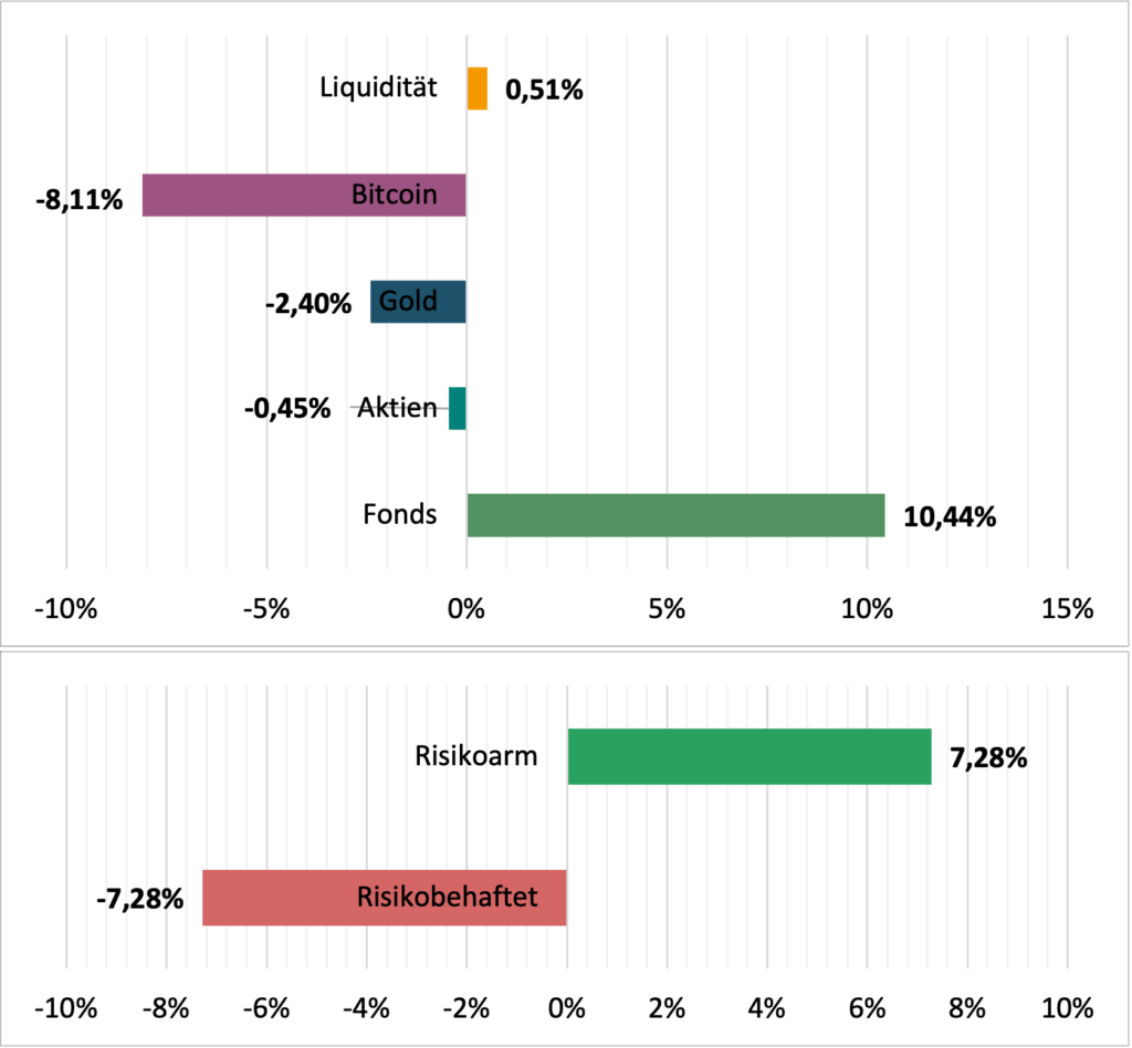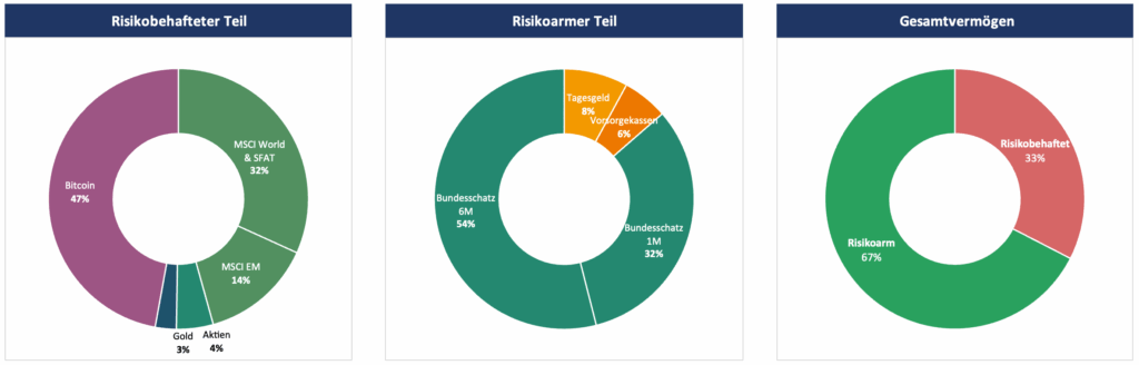 Im risikobehafteten Teil kam es durch fallende Kurse bei Bitcoin und Strategy zu geringfügigen Verschiebungen, aber im wesentlichen sieht es hier nicht schlecht aus. Trotz einiger Nachkäufe habe ich die Liquidität beibehalten, somit besteht noch etwas Liquiditätsreserve für den Dezember und auch für die Überziehung durch Flatex beim Einzug der Sparpläne.
