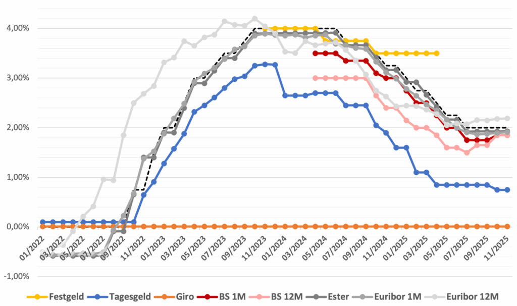 Was tut sich am Zinsmarkt? Aktuell nicht so viel und laut EZB-Watch-Tool wird sich das auch im Dezember nicht ändern. Der Leitzins wird mit 95% Wahrscheinlichkeit unverändert bleiben. Aber mit meinen Zinsen bei Bundesschatz und TR bin ich eh sehr zufrieden, auch wenn sie die Inflation in Österreich nicht ausgleichen können.