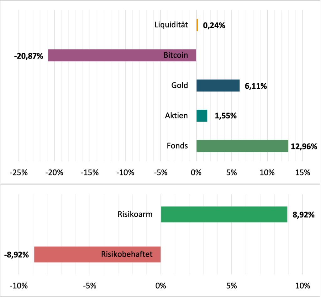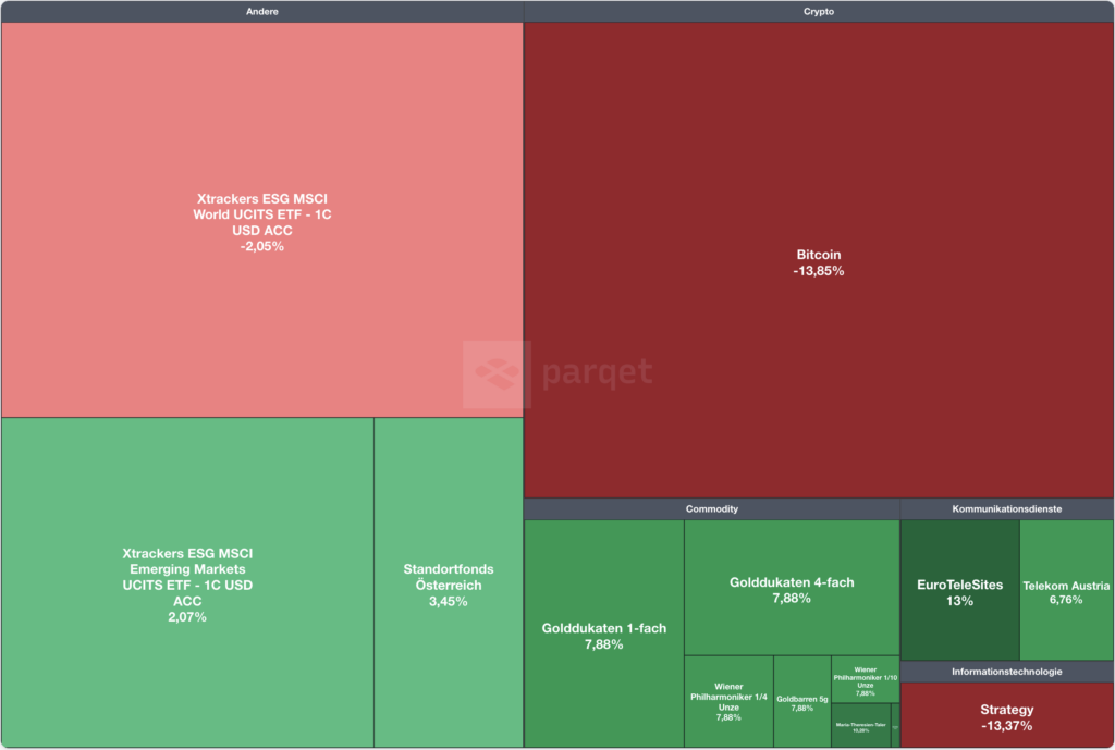 Knapp -14% hat der Kurs in den letzten 30 Tagen nachgegeben, sogar stärker als Strategy. Besser sieht es bei den anderen Assets aus, insbesondere Europa mit dem Standortfonds und meine österreichischen Einzelwerte haben zugelegt, aber auch die Edelmetalle erholten sich wieder etwas.