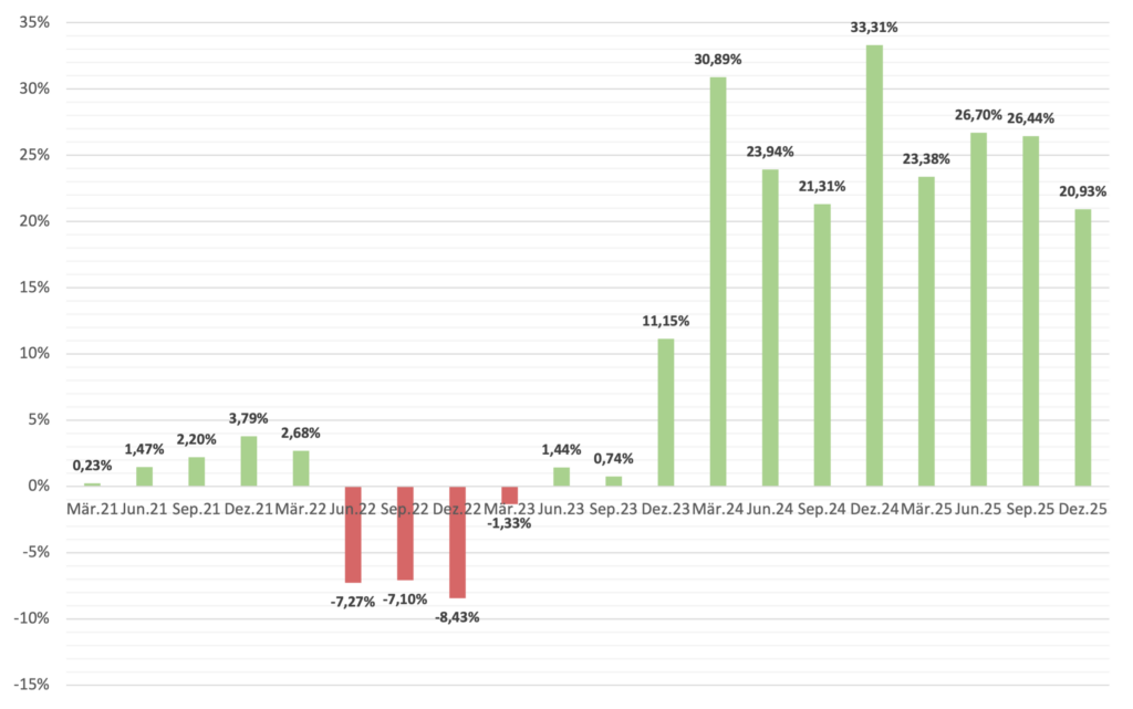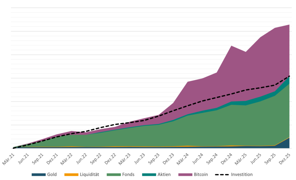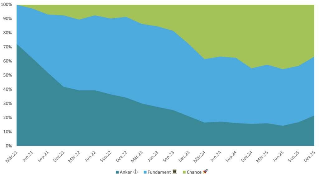 Sämtliche folgenden Charts werden nur quartalsweise aktualisiert, beziehen sich ausschließlich auf den risikobehafteten Teil des Portfolios und enthalten auch nur Werte zum jeweiligen Quartalsabschluss.