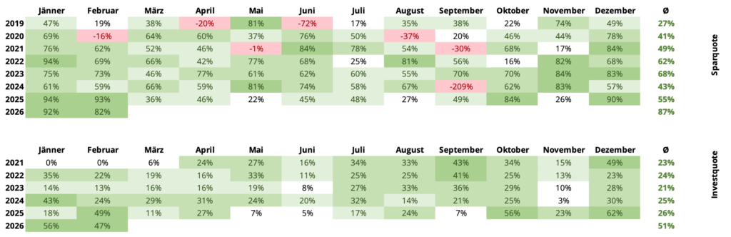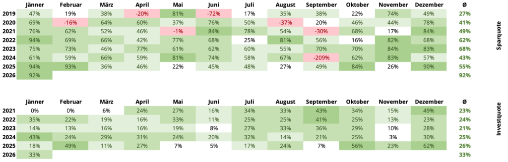 Auf dieser Seite kann die Entwicklung meines langfristigen Investement-Portfolio’s verfolgt und ein aktueller Stand mit % Aufteilung eingesehen werden. Zu Beginn wird meine Sparquote (inkl. Einlagen) sowie meine Investitionsquote (exkl. Einlagen) bezogen auf mein monatliches Einkommen in Form einer Heatmap dargestellt.